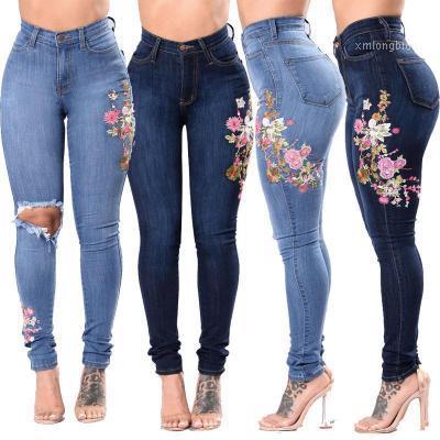 Femmes Denim Floral Broderie High Stretch Jeans Big Yard Lumière Bleu Dark Blue Leggings Pantalon Pants1
